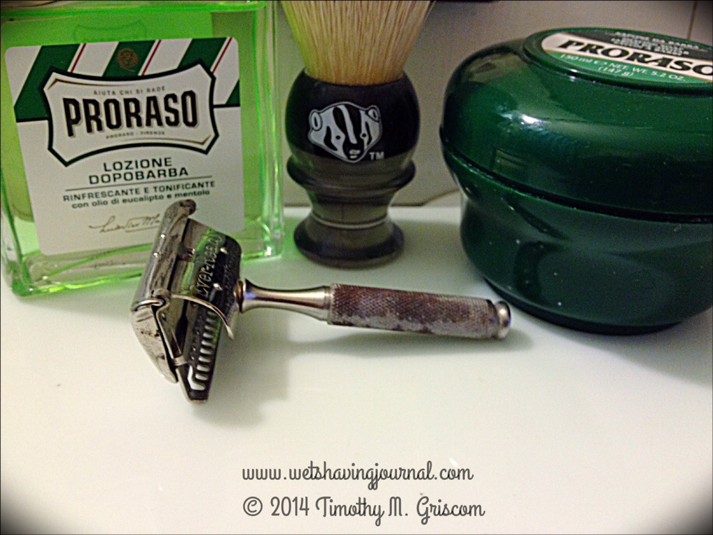 3Mar2014 Ever-Ready 1914 Posted in Gem/ EverReady, Uncategorized by timgriscom Shave of the Day March 2, 2014 Ever-Ready 14 100th Anniversary Month Prorasso green tub soap Omega boar brush Ever-Ready 1914 razor Gem PTFE coated stainless steel blade (2) Prorasso aftershave