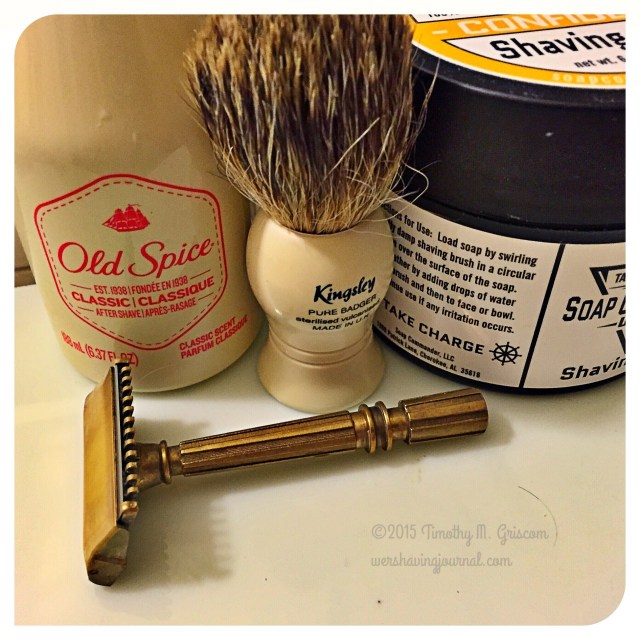 16Aug2015 Gem Micromatic Posted in Gem/ EverReady, Micromatic, Open Comb by timgriscom Shave of the Day August 16, 2016 Soap Commander Confidence soap Kingsley badger brush Gem Micromatic open comb razor Gem coated stainless steel blade (2) Old Spice aftershave