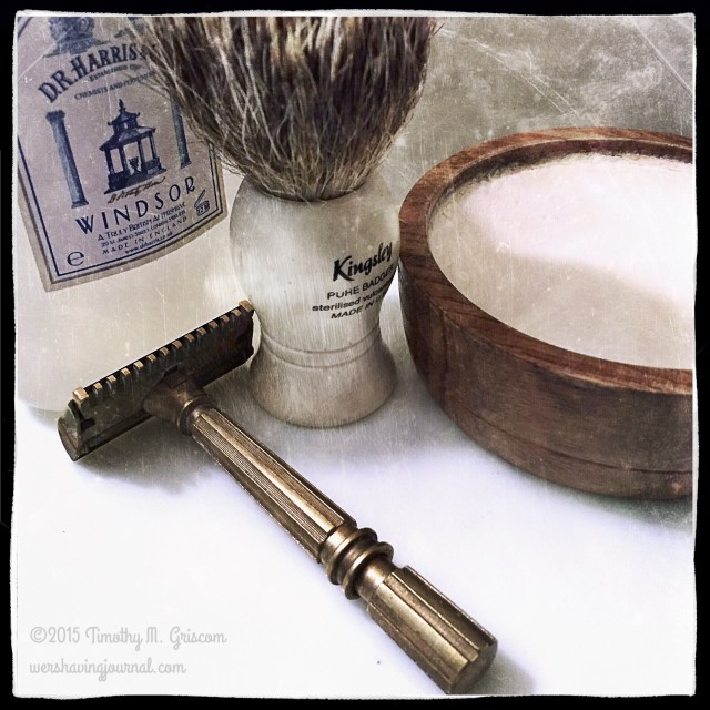 7Oct2015 Gem Micromatic Posted in Gem/ EverReady, Micromatic, Open Comb by timgriscom Shave of the Day OCtober 7, 2015 DR Harris Windsor soap Kingsley badger brush Gem Micromatic open comb Gem coated stainless steel blade (9) Windsor aftershave