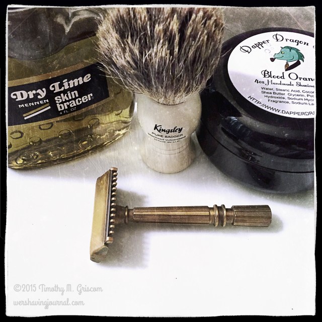 9Oct2015 Gem Micromatic Posted in Gem/ EverReady, Micromatic, Open Comb by timgriscom Shave of the Day OCtober 9, 2015 Dapper Dragon Blood Orange soap Kingsley badger brush Gem Micromatic open comb Gem coated stainless steel blade (11) Skin Bracer Dry Lime aftershave A citrusy shave. Fresh! How long will this blade last?