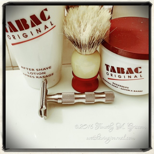 12Apr2016 Mongoose B2 Posted in B2, Mongoose, Uncategorized by timgriscom Shave of the Day April 12, 2016 #loveforluke Tabac soap Ever-Ready C40 boar brush Mongoose B2 razor Feather Professional blade (2) Tabac aftershave
