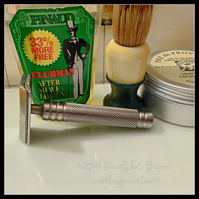 7Aug2016 Mongoose Posted in B2, Mongoose, Uncategorized by timgriscom Shave of the Day August 7, 2016 #loveforluke Pre de Provence soap Ever-Ready brush Mongoose razor Feather Professional blade (3) Pinaud Clubman aftershave